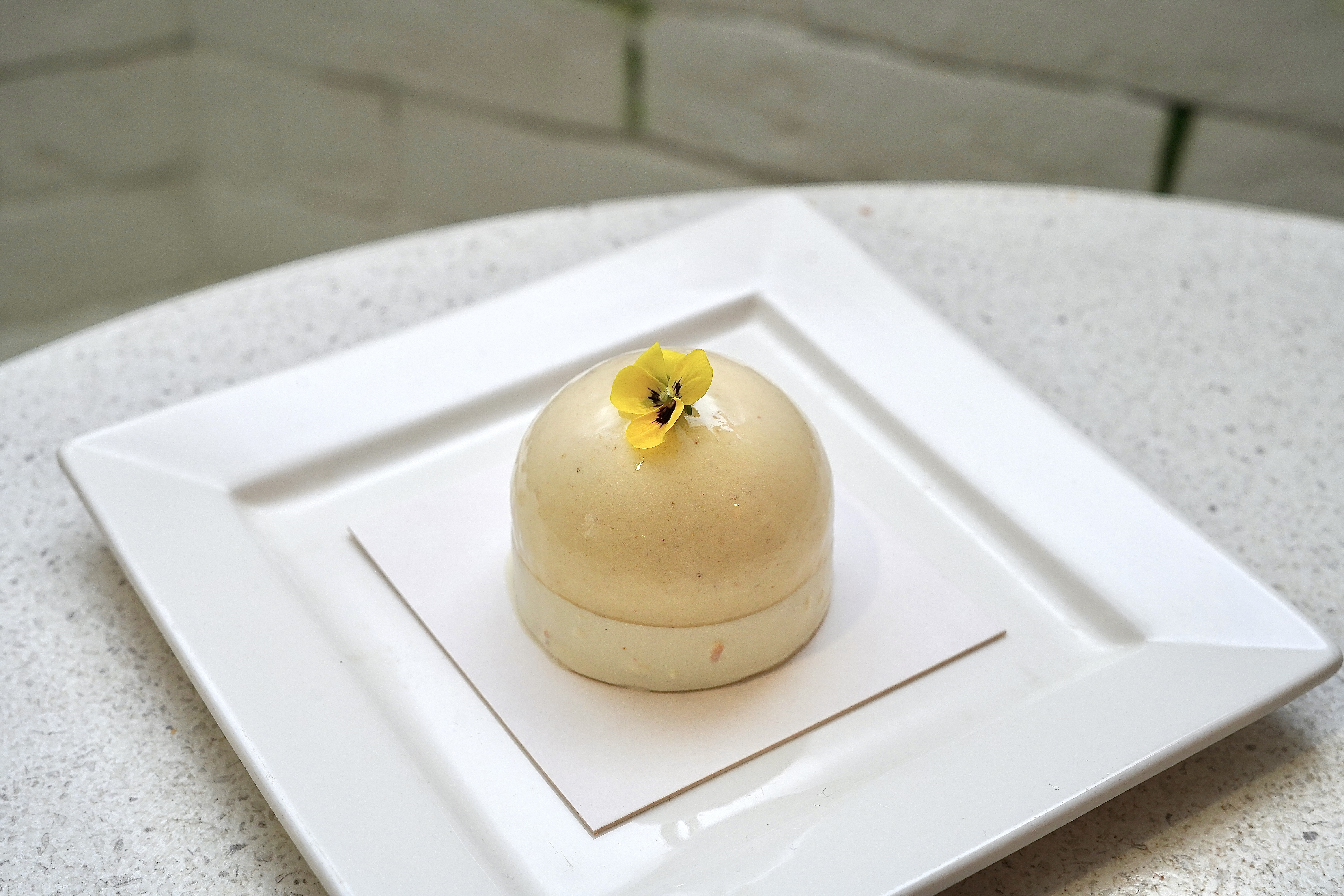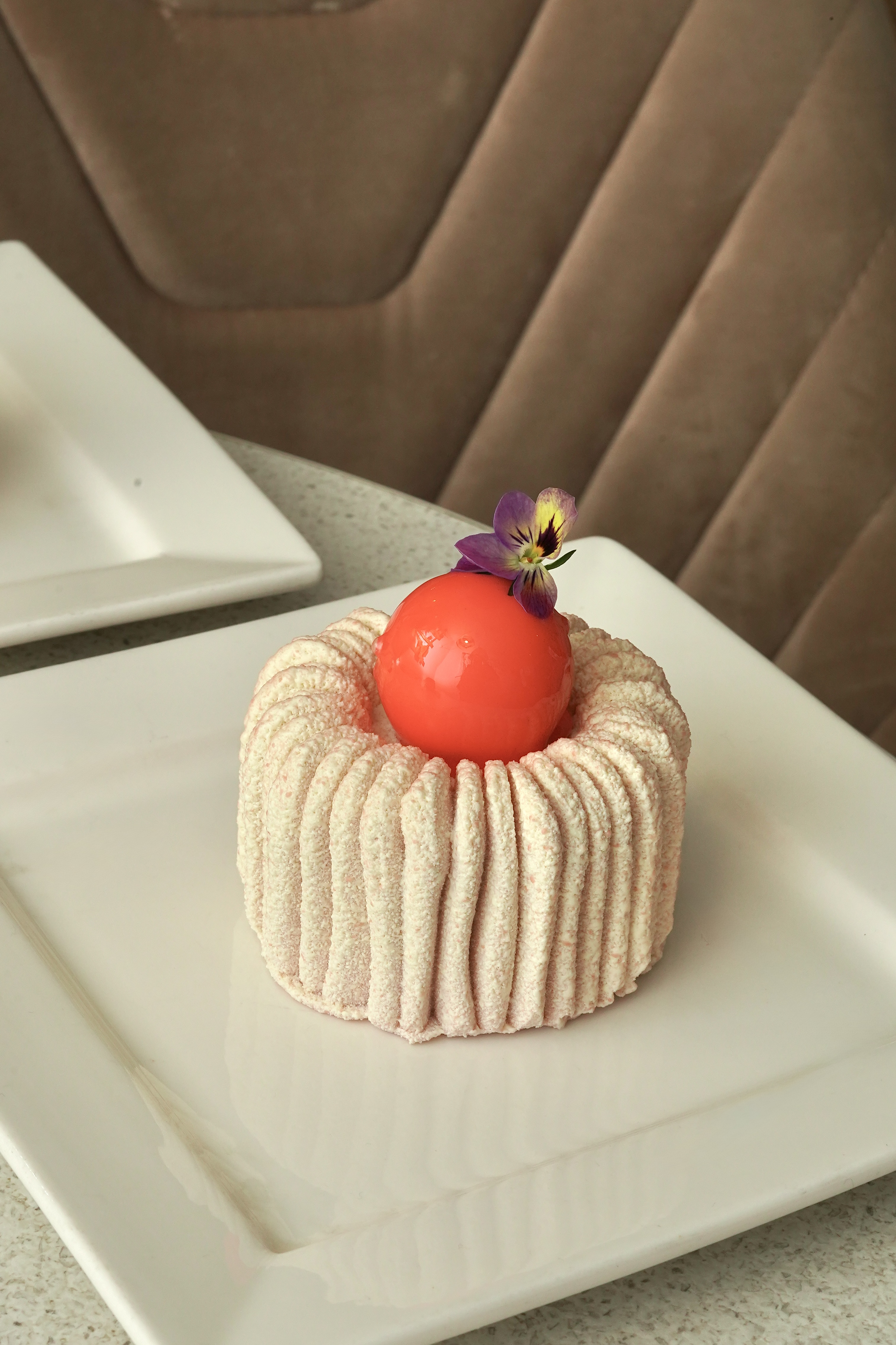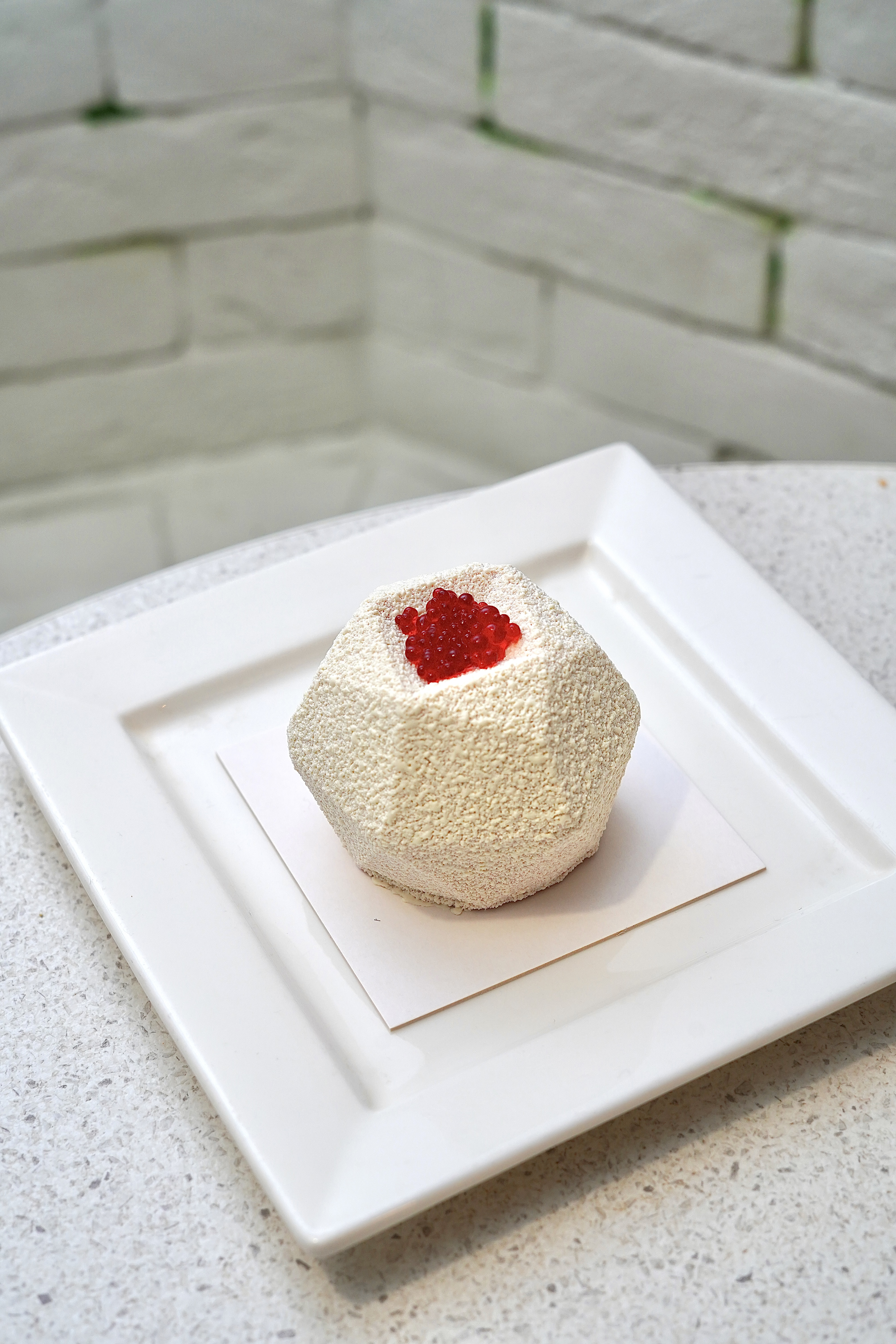 Мусс из красной смородины, начинка из красной смородины с яблоком, миндальный бисквит, ванильный крем и шоколадная глазурь